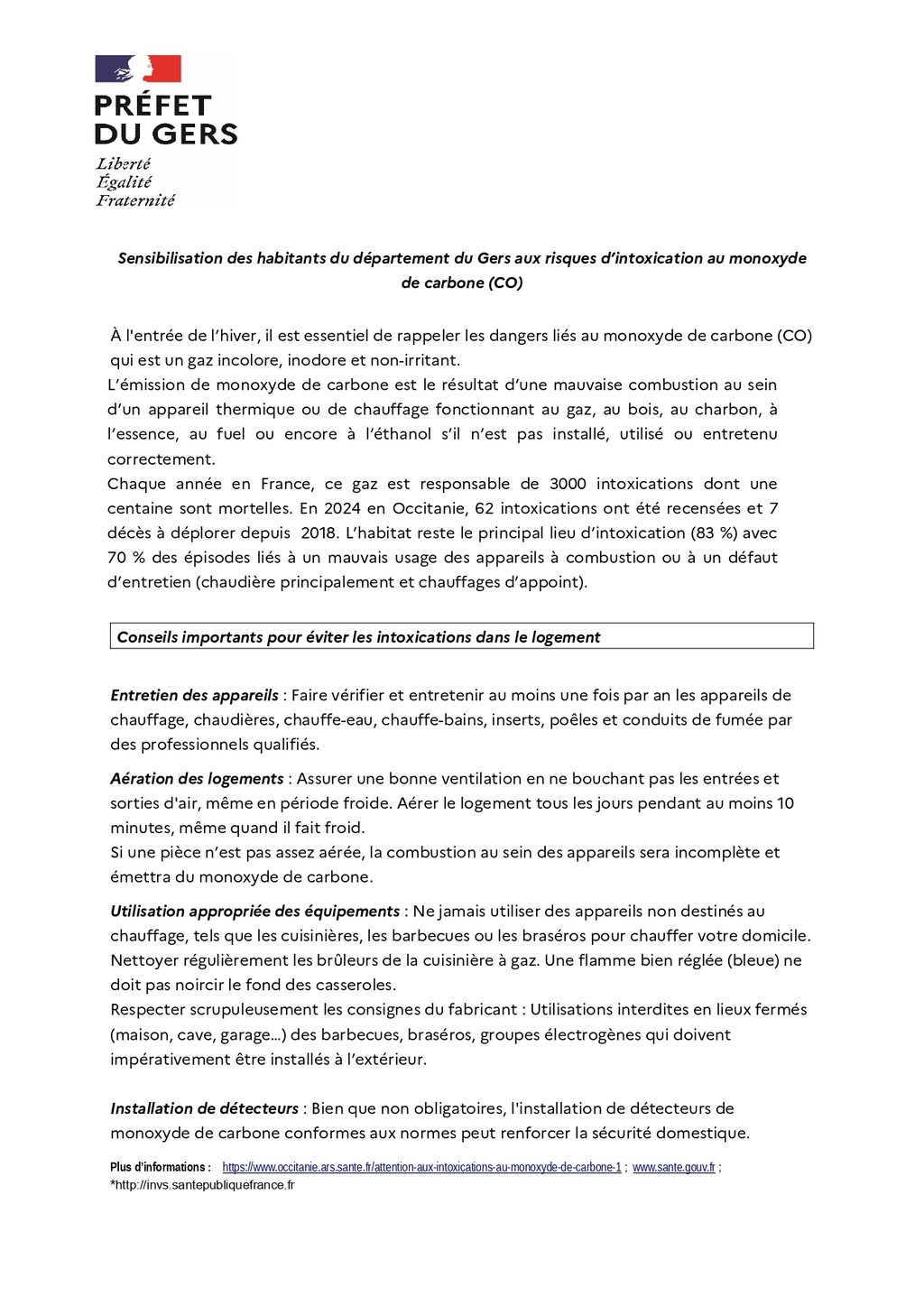 La Préfecture du Gers alerte sur les risques d'intoxication au monoxyde de carbone, et plus particulièrement en période hivernale.