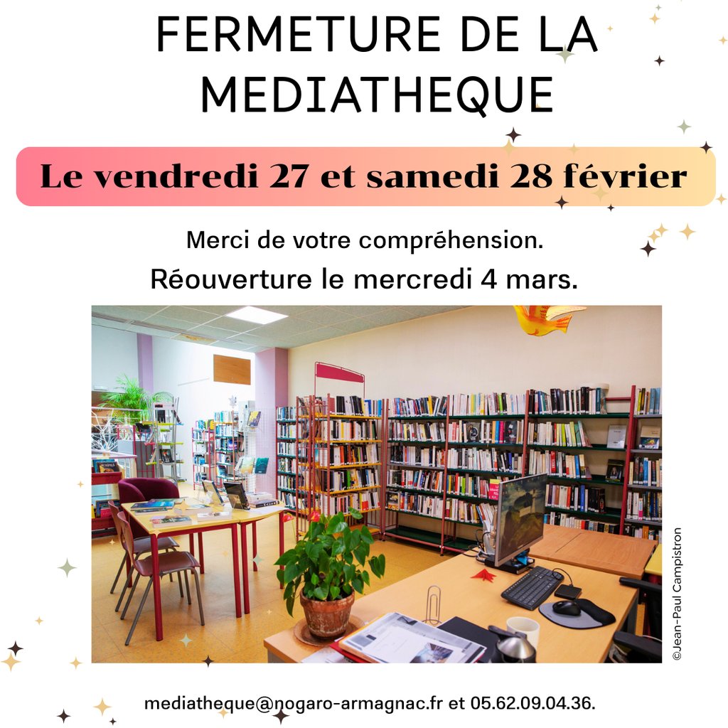 Pour information, la médiathèque sera fermée les vendredis 27 et samedis 28 février.