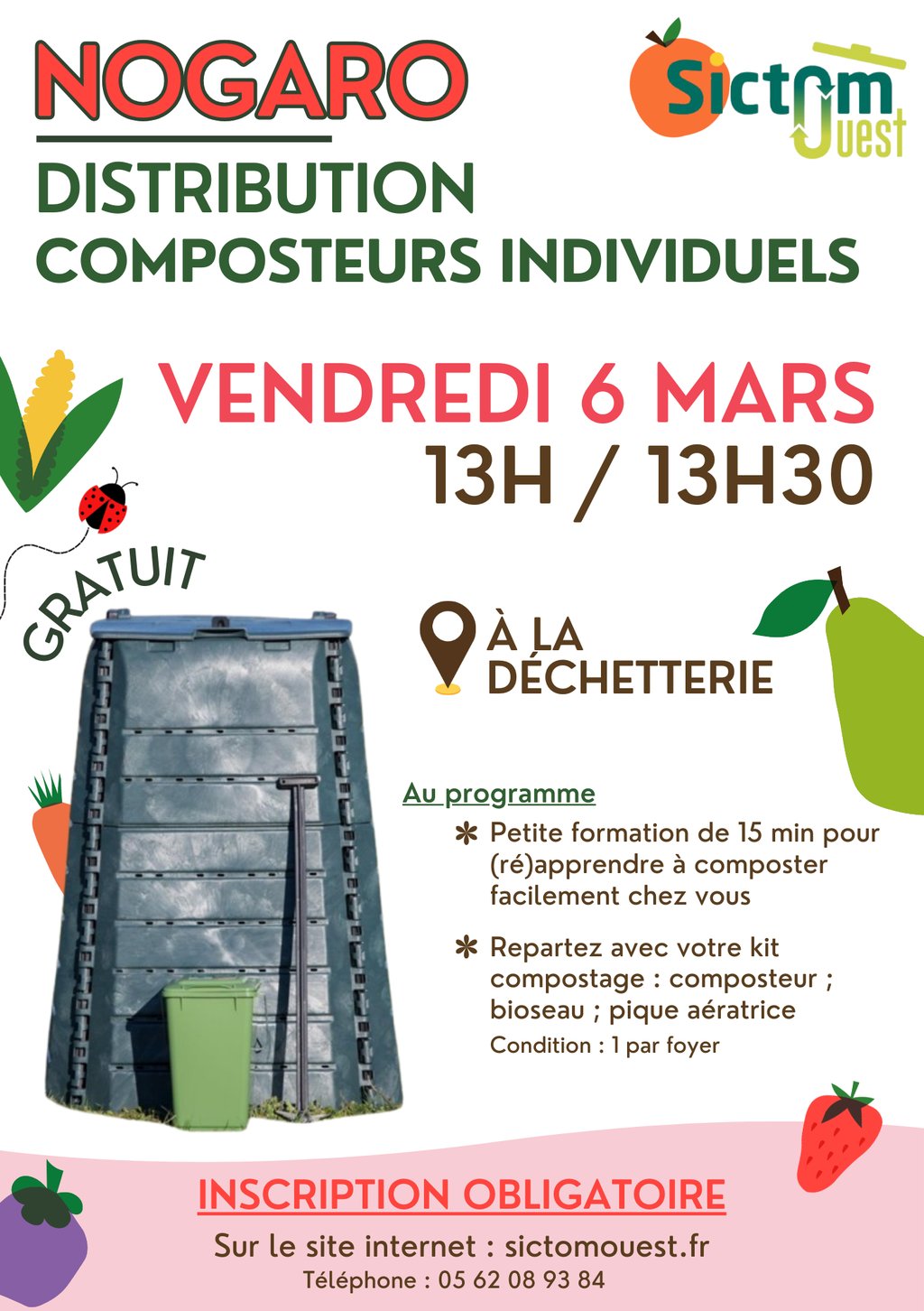 Dans le cadre de la loi sur les biodéchets et de la réduction des ordures ménagères, le SICTOM organise une distribution de composteurs individuels à la déchetterie de Nogaro le vendredi 6 mars de 13h00 à 13h30/
