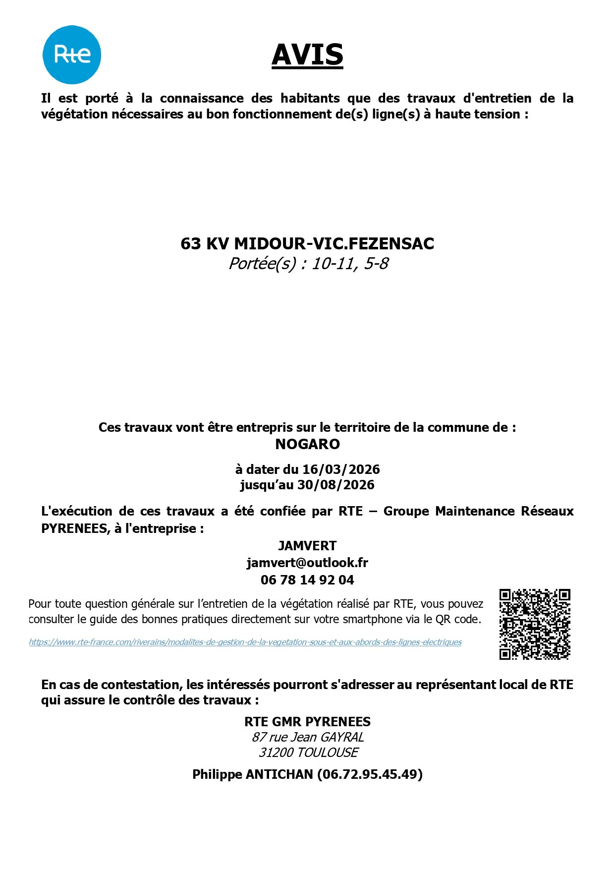 Des travaux d'entretien de la végétation nécessaires au bon fonctionnement des lignes à haute tension sont prévus sur le territoire de la commune du 16 mars au 30 août 2026.
