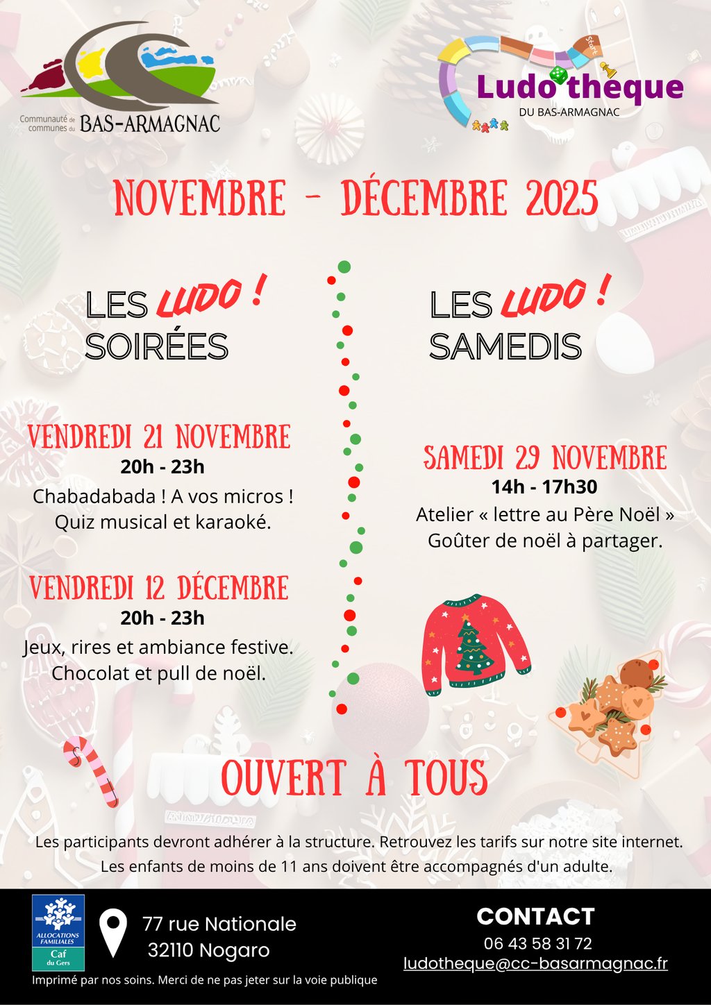 Ludo samedi : samedi 29 novembre de 14h à 17h30.